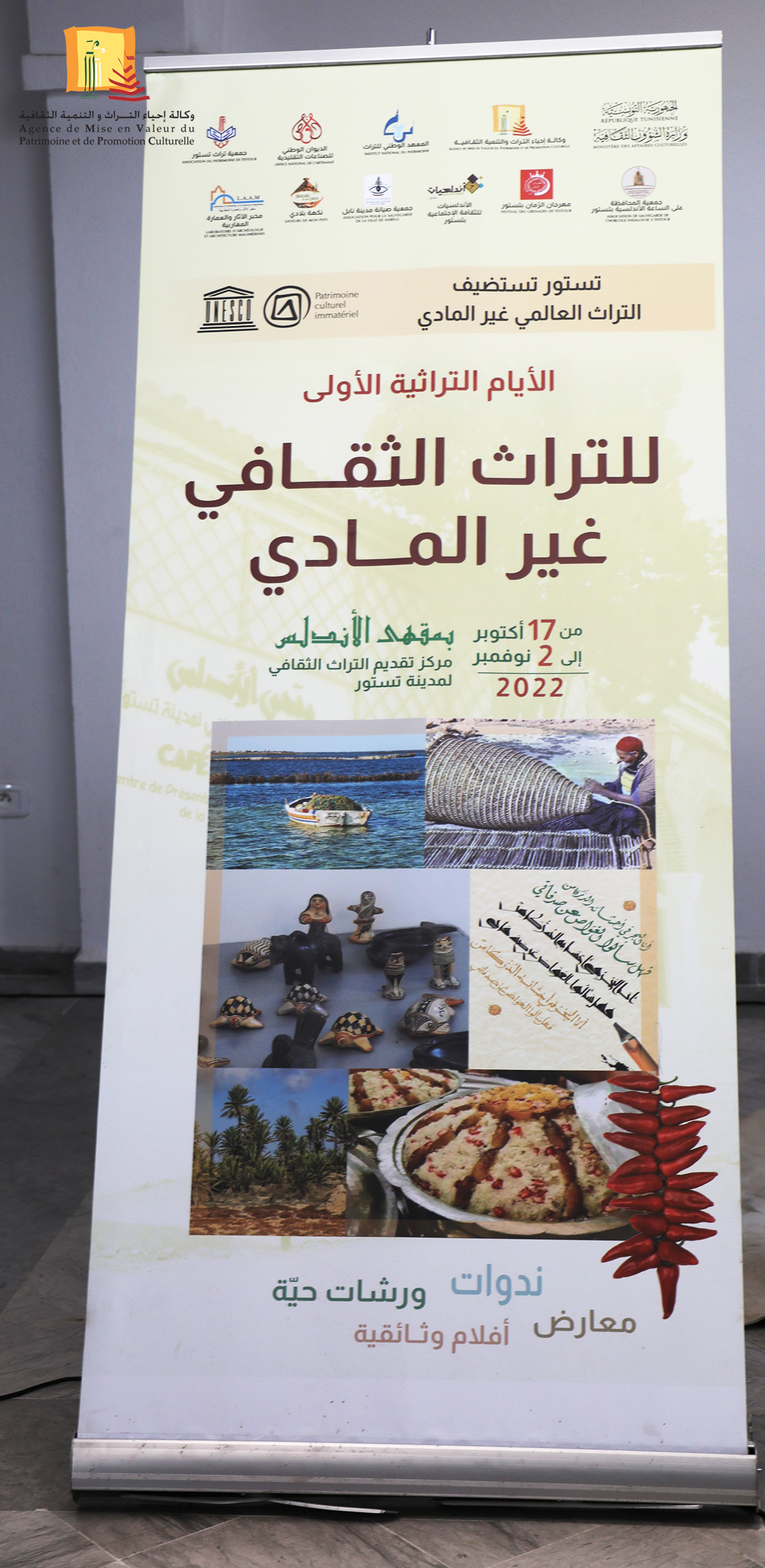 يًذكر أنّ وكالة إحياء التراث والتنمية الثقافية نظّمت الأيام التّــراثية الأولى للتراث الثقافي غير المادي بمركز تقديم التراث الثقافي بمدينة تستور: مقهى الأندلس من 17 أكتوبر إلى 2 نوفمبر 2022 بالتعاون مع المعهد الوطني للتّراث والدّيوان الوطني للصناعات التقليدية وجمعيّة تراث تستور وجمعية المحافظة على الساعة الأندلسية بتستور ومهرجان الرمان بتستور وجمعية الأندلسيات للثقافة الاجتماعية بتستور وجمعية صيانة مدينة نابل وجمعية نكهة بلادي ومخبر الآثار والعمارة المغاربية وذلك في إطار الاستعداد للاحتفاء بالذكرى العشرين لاعتماد منظمة الأمم المتحدة للتربية والعلم والثقافة (اليونسكو) اتفاقية صون التراث الثقافي غير المادي في 17 أكتوبر 2003.