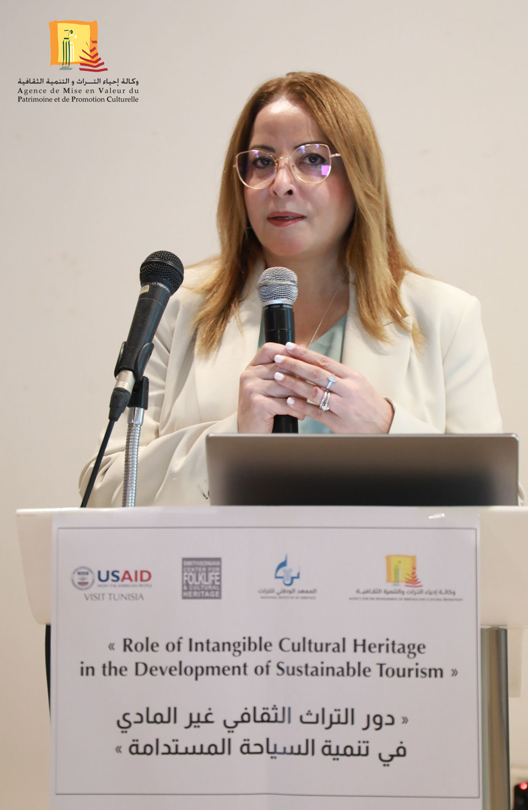 وفي كلمة ألقتها في افتتاح هذه الندوة العلمية، رحّبت السيدة المديرة العامة بالضيوف الحاضرين وبكل الشركاء في تنظيم هذه الندوة العلمية مؤكدة على أهمية التراث الثقافي غير المادي باعتباره محرّكا للتنمية ولسياحة مستدامة قادرة أن يكون لها وقع إيجابي على المجتمعات المحلية. وأشارت في كلمتها على ارتباط التراث الثقافي غير المادي بالإنسان وهو ما يفترض توفير الشروط الملائمة لمساعدة المجتمعات لصون هذا التراث الحساس دون تعريضه للخطر.
