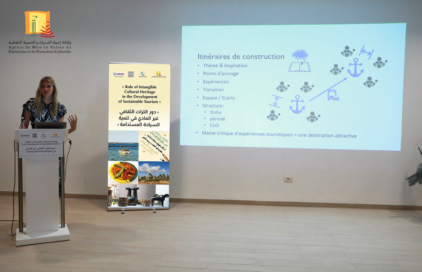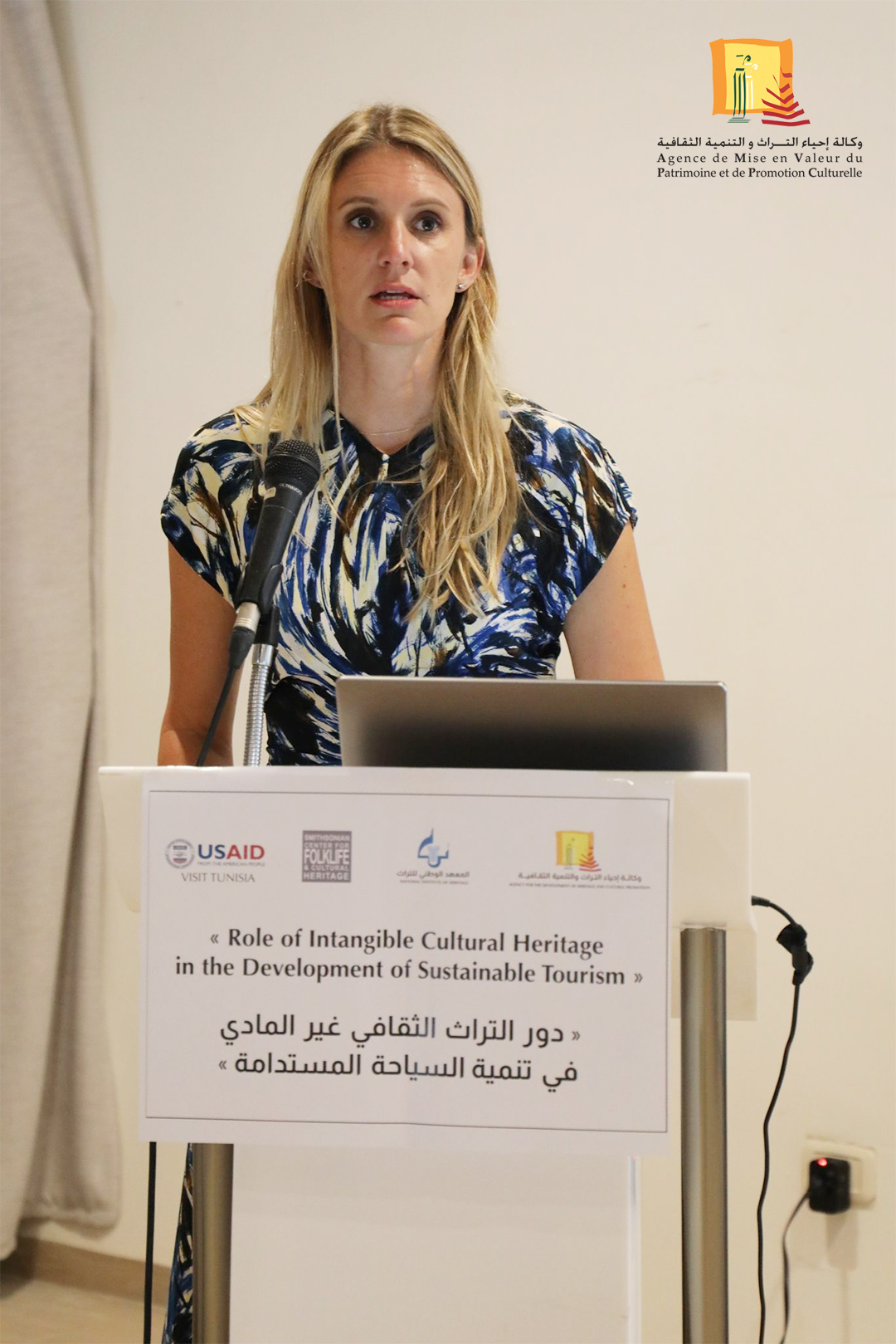 وقدّمت السيدة هالي بوتفين، ممثلة مؤسسة سميثسونيان، مداخلة تعرّف فيها الحاضرون على هذا المركز وتجربته في تثمين التّراث الثقافي عموما، والتّراث الثقافي غير الماديّ بالخصوص ودوره في دعم السياحة المستدامة. وتطرقت بالمناسبة إلى المشروع التجريبي Tunisia Living Culture" أو الثقافة الحية في تونس المنقسم إلى أربع مراحل والذي سيمتد على سنتين.