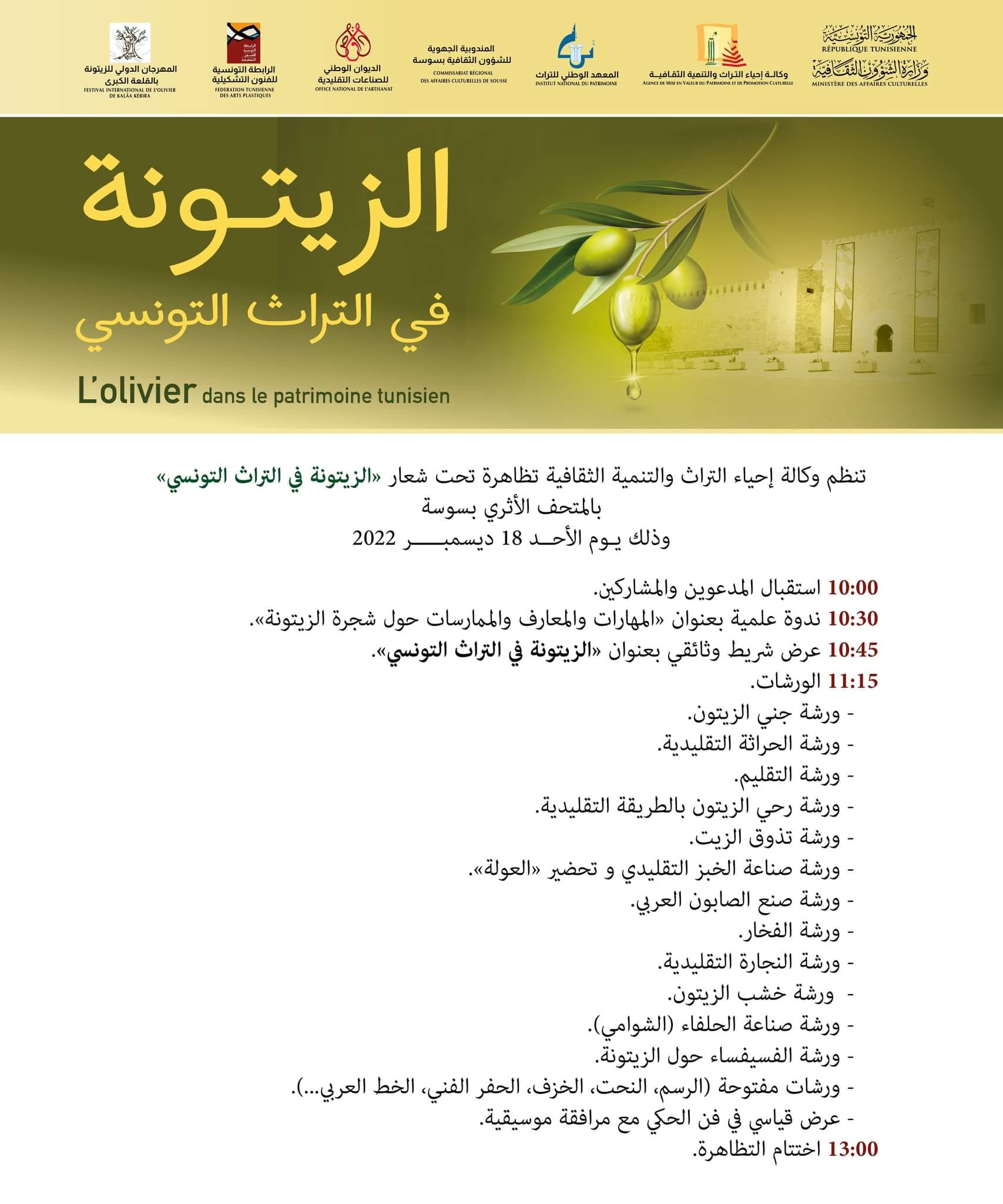 في إطار تثمين موروثنا الحضاري والثّقافي والتعريف بأهميته لدى الناشئة، تُنظّم وكالة إحياء التراث والتنمية الثقافية بالتّعاون مع المعهد الوطني للتراث والمندوبية الجهويّة للشّؤون الثقافية بسوسة والديوان الوطنيّ للصّناعات التقليديّة والرابطة التّونسية للفنون التشكيليّة والمهرجان الدّولي للزيتونة بالقلعة الكبرى، تظاهرة ثقافية تحمل شعار "الزيتـــــونة في التّــــراث التّــــونسي" وذلك يوم الأحد 18 ديسمبر 2022 بالمتحف الأثري بسوسة