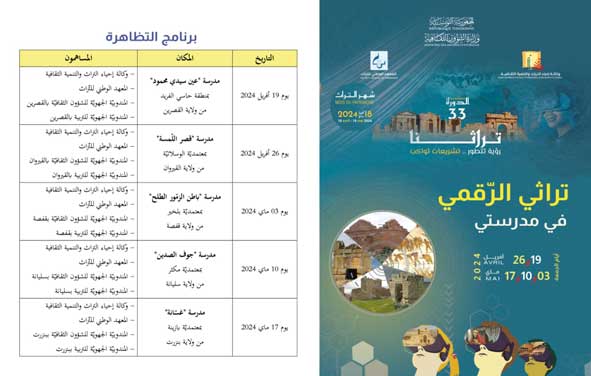 بمناسبة الدّورة 33 لشهر التّراث (18 أفريل – 18 ماي 2024) وفي إطار حملة توعية بأهميّة التّراث الوطني وضرورة المحافظة عليه، تنظّم وكالة إحياء التّراث والتّنمية الثقافيّة بالشراكة مع المعهد الوطني للتّراث تظاهرة ثقافيّة تربويّة تحت عنوان "تراثي الرّقمي في مدرستي" تتمثّل في تأمين زيارات ميدانيّة إلى المدارس الابتدائيّة المتواجدة بالمناطق الريفيّة والتي تحاذيها مواقع أثريّة وذلك بغية إطلاع تلاميذ هذه المدارس على ثراء مخزوننا التّراثي باستعمال وسائط رقميّة مبسّطة (تجارب رقميّة غامرة في الواقع الافتراضي والواقع المعزّز بواسطة Casque VR لعدد من المتاحف والمواقع الأثريّة والمعالم التاريخيّة).
