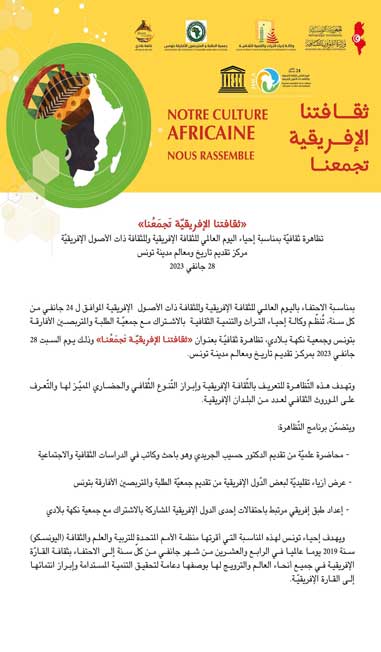 بمناسبة الاحتفاء باليوم العالمي للثقافة الإفريقية والثقافة ذات الأصول الإفريقية الذي أقرته منظمة اليونسكو يوم 24 جانفي من كل سنة، تُنظّم وكالة إحياء التراث والتنمية الثقافية بالاشتراك مع جمعيّة الطلبة والمتربصين الأفارقة بتونس وجمعية نكهة بلادي، تظاهرة ثقافيّة بعنوان" ثقافتنا الإفريقيّة تجمعنا" وذلك يوم السبت 28 جانفي 2023 بمركز تقديم تاريخ ومعالم مدينة تونس.