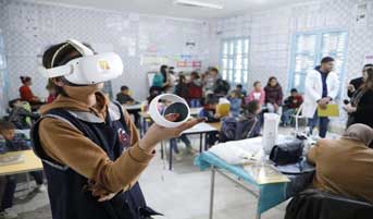 ثم خاض الأطفال تجربة الزيارة الافتراضية للمواقع الأثرية عبر تقنية ثلاثية الأبعاد التي أعطت اجواء من الحماس والمتعة بين صفوف التلاميذ كما لاقت استحسان المربين لما تركته من اثر نفسي ومعرفي لدى التلاميذ.