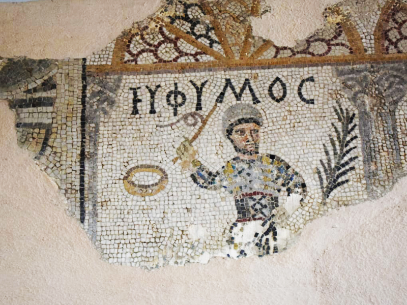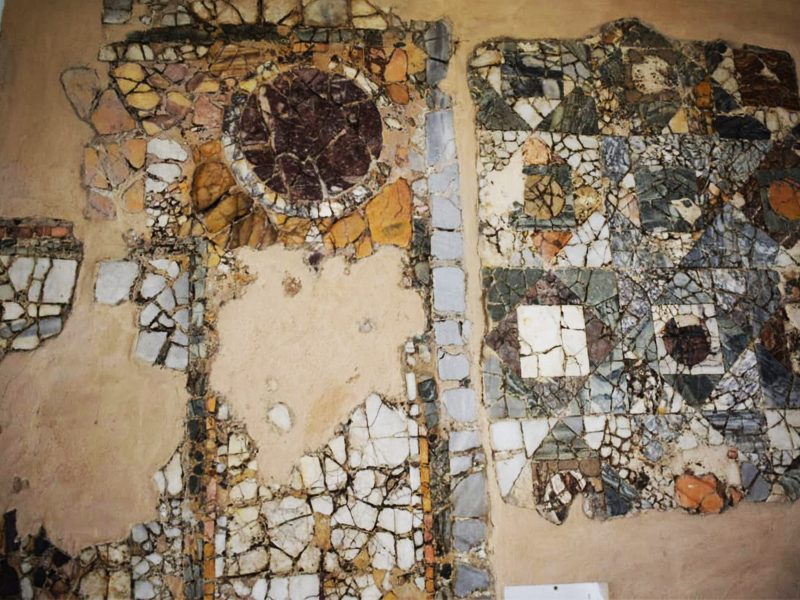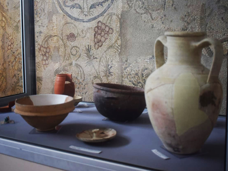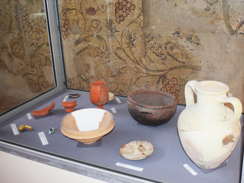 يعرض المتحف لوحات فسيفسائية ترجع إلى القرن الخامس كانت تزخرف منزلا فخما عثر عليه قرب المتحف وتجسد أربعة متنافسين في سباق العربات يحملون رمز الإنتصار . ومن نفس المنزل المذكور جلبت الأرضية المزخرفة بقطع من الرخام متعدد الألوان.