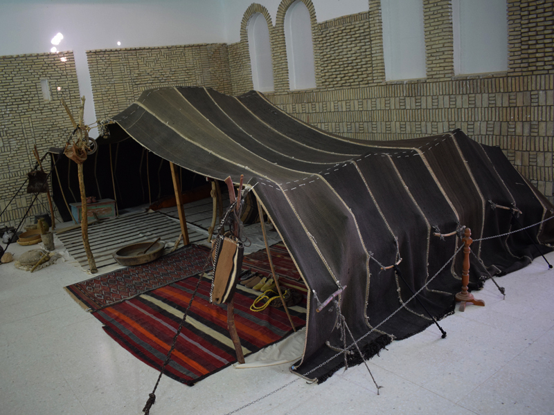 لا يمكن لمتحف يمثل البدو الرحل أن لا يحتوي على مسكنهم المتنقل، الخيمة، لذلك انتصب نموذج منها وسط قاعة العرض وكأنها في بيئتها الطبيعية وبداخلها وأمامها أواني وأدوات وأثاث مختلف الاستعمالات فمنها ما يتعلق بالمرأة كالبرمة ومنها ما يتصل بحياة الرجل كمخلاة.