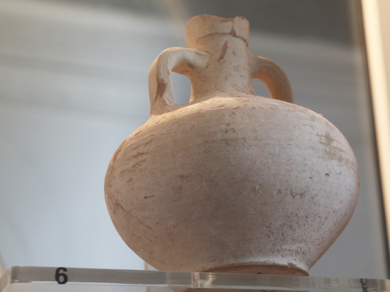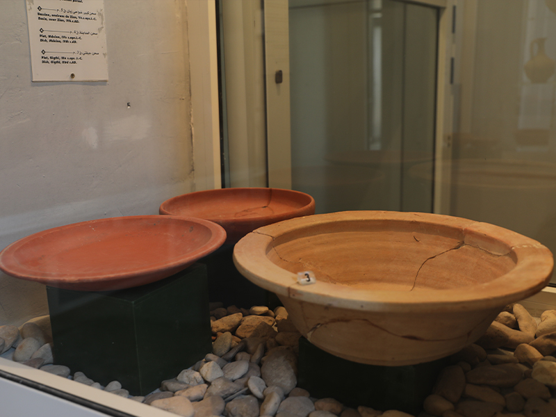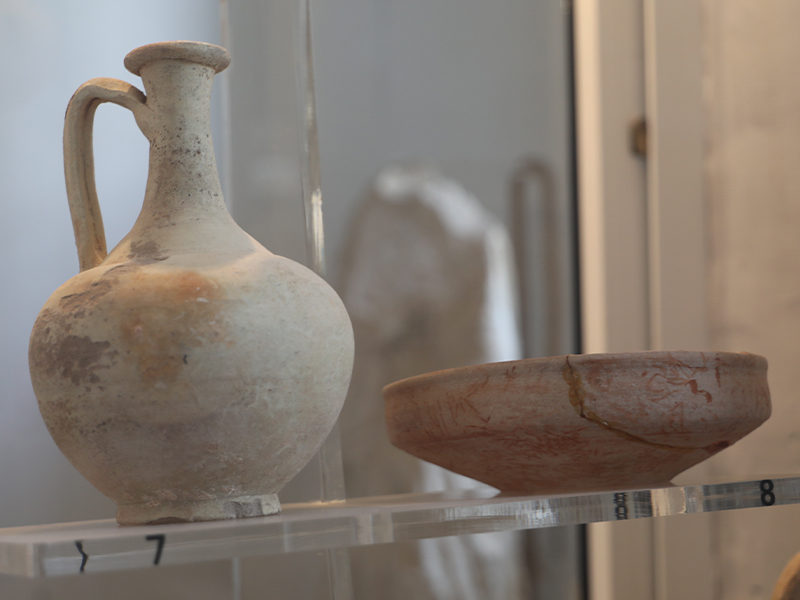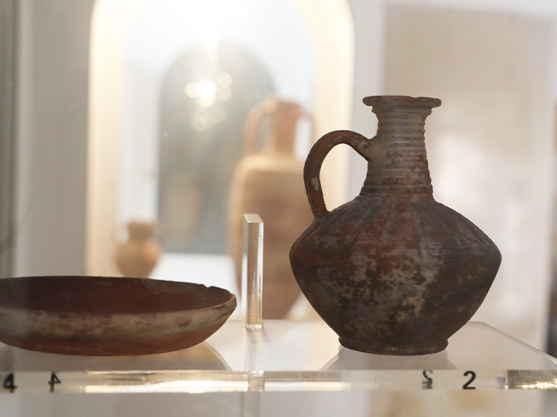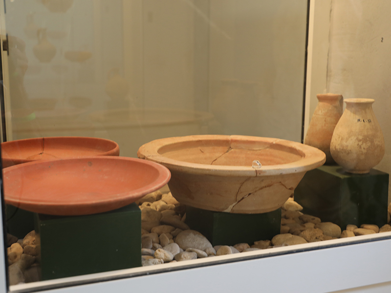 أما الواجهات بالجهة اليسرى فتُعرض فيها مجموعة من الجرار التي اكـتُشـفت بموقعي زيان وشمّـاخ أين عثر الآثاريون على بقايا أفران لصنع الفـخار. وكانت هذه الجرارمخصصة لنـقل الزيـوت والمنتوجات البحرية مثل الأسماك المملحة والقاروم.وتعرض واجهات أخرى أثاثا جنائزيا اكتُشف بمقابر شمّاخ ويتمثل في جرار وأكواب وصحون من النوع الآريتيني المستورد من إيطاليا، إضافة إلى سلة من الفخار كانت تستعمل في طقوس متصلة بالإلهة المصرية إيزيس. وتُعرض بالواجهة الأخيرة مواد تنتجها شبه جزيرة جرجيس مثل الزيوت والملح والمنتوجات البحرية وخاصة الإسفنج.