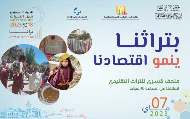 ضمن فعاليات الدورة الثانية والثلاثين لشهر التراث، تُنظّم وكالة إحياء التراث والتنمية الثقافية بالشراكة مع المعهد الوطني للتراث، تظاهرة ثقافية بعنوان "بتراثنا ينمو اقتصادنا" وذلك يوم الأحد 7 ماي 2023 بمتحف كسرى للتراث التقليدي