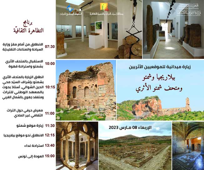 في إطار توجّه وكالة إحياء التّراث والتنمية الثقافيّة لدعم اللاّمركزية الثقافيّة وتثمين التّراث الثقافي بشقيّه المادّي وغير المادّي والتعريف بخصوصياته الجهويّة والمحليّة وتثمينها، وتجسيما للاتفاقيّة المبرمة بين وزارة الإشراف والنقابة الوطنيّة للصحفيين التونسيين، تُنظّم وكالة إحياء التّراث والتنمية الثقافيّة تحت إشراف وزارة الشؤون الثقافية وبالتعاون مع المعهد الوطنيّ للتّراث يوم الإربعاء 8 مارس 2023 زيارة مؤطرّة للصحفيين للموقعين الأثريين بلاّريجيا وشمتو ومتحف شمتو الأثري.