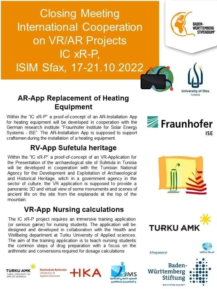 يذكر أن المعهد العالي للإعلامية والملتيميديا بصفاقس يحتضن من 17 إلى 21 أكتوبر 2022 اختتام السنة الثانية من مشروع الواقع الافتراضي المختلط والمعزز وهو مشروع يمتد على 3 سنوات تشارك فيها طلبة من كل من تونس وألمانيا وفنلندا.