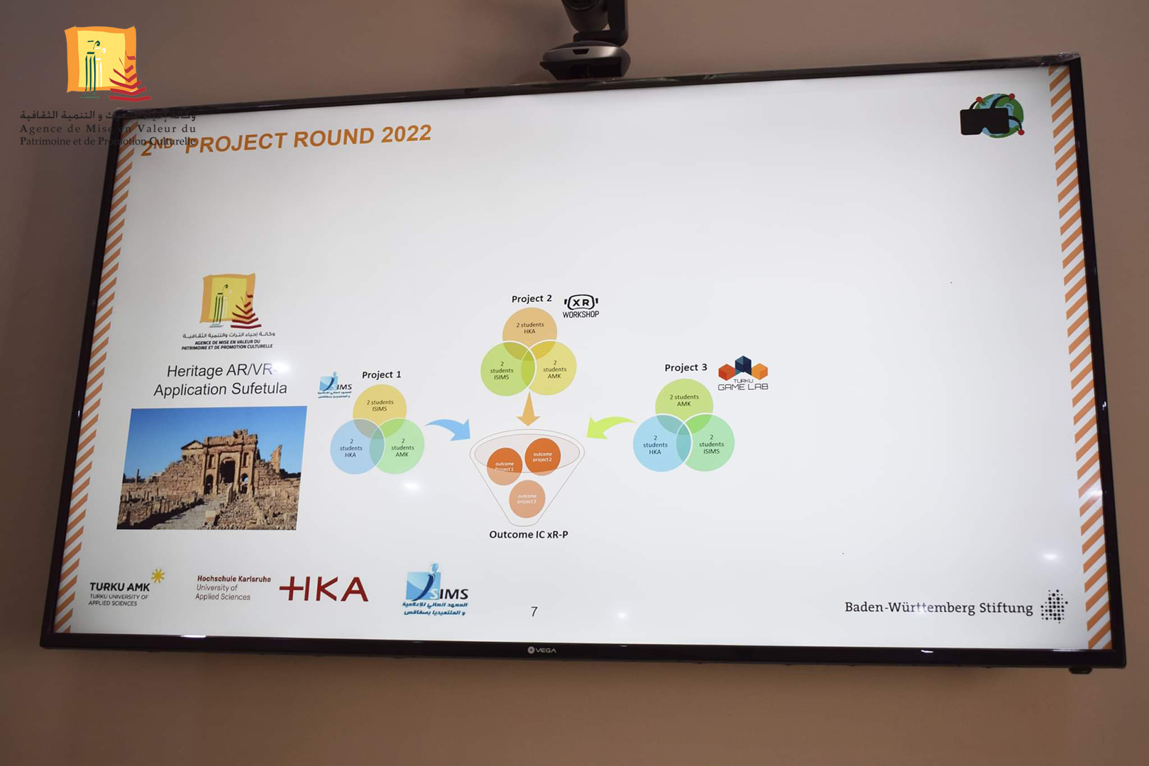 وتقدم خلال الأيام الاختتامية للمشروع ثلاثة مشاريع تم إنجازها خلال هذه السنة من ذلك مشروع زيارة الموقع الأثري بسبيطلة عبر تقنية الواقع الافتراضي المنجز من طرف طلبة دوليين بالشراكة مع وكالة احياء التراث والتنمية الثقافية والمعهد العالي للاعلامية والملتميديا بصفاقس بحضور الطلبة الأجانب مرفوقين بأساتذتهم.