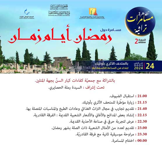 احتفاءً بشهر رمضان المعظّم وفي إطار الأنشطة والتّظاهرات الثّقافية المبرمجة تزامنا مع هذه المناسبة الدينية، تنظّم وكالة إحياء التّراث والتنمية الثقافيّة بالشراكة مع المعهد الوطني للتّراث "مسامرات تراثيّة" وذلك يوم الأحد 24 مارس 2024 بالمتحف الأثري بأوتيك ابتداء من الساعة التاسعة ليلا.