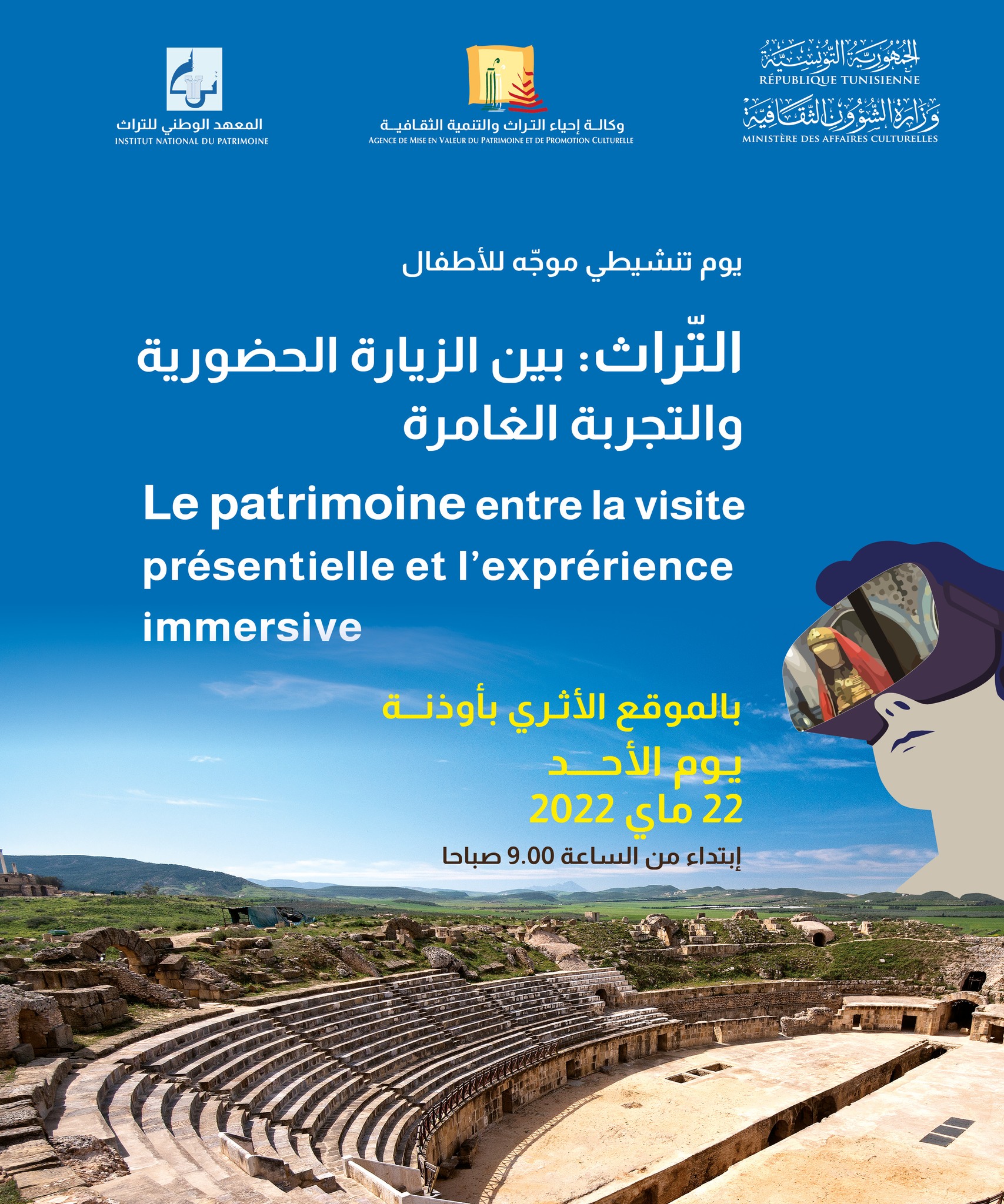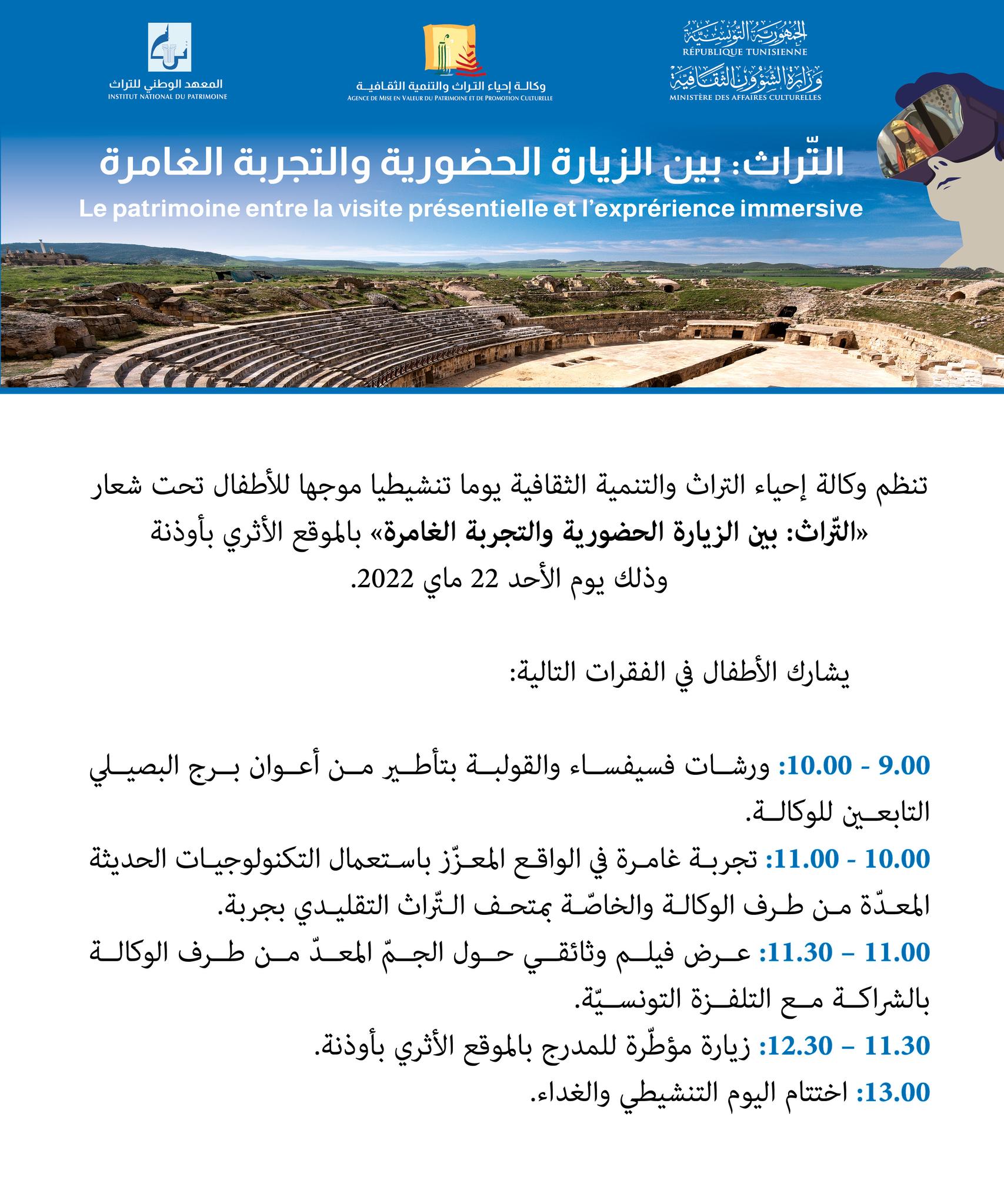 في إطار سعيها لرفع الوعي بأهمية التراث الثقافي ومواصلةً للأيّام التنشيطيّة الموجّهة للناشئة، تنظّم وكالة إحياء التراث والتنمية الثقافية يوما تنشيطيًّا موجّهًا للأطفال بالموقع الأثري بأوذنة تحت شعار "التّراث: بين الزيارة الحضورية والتجربة الغامرة " وذلك يوم الأحد 22 ماي 2022 .