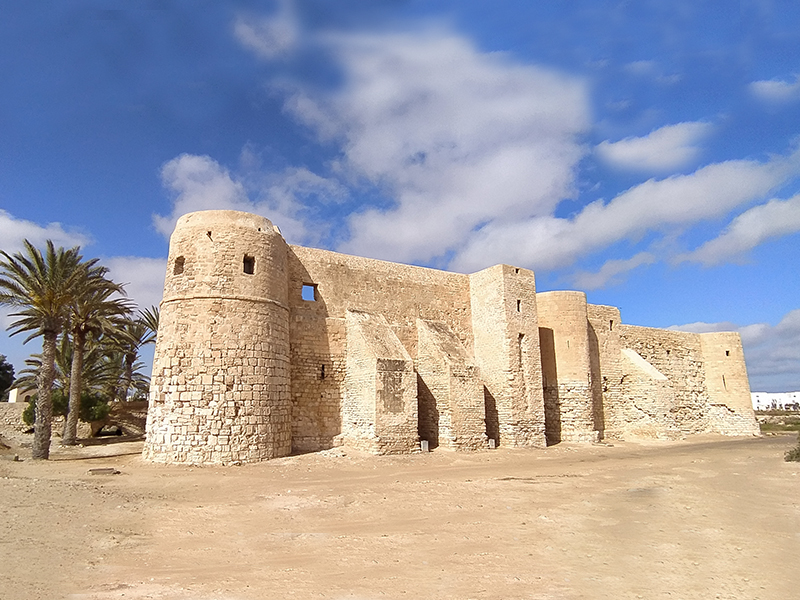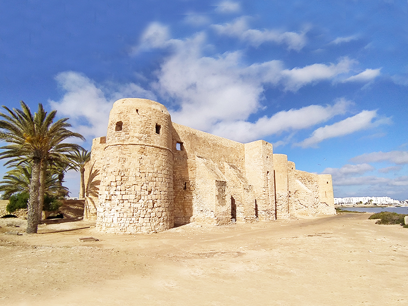 يقع برج الغازي مصطفى بحومة السوق بالقرب من الميناء الرئيسي للجزيرة. ويعود بناء هذا المعلم الذي تبلغ أبعاده 68 مترا على 53 مترا إلى الفترة الحفصيّة و بالتحديد الى سنة 1425 في ظل حكم أبي فارس عبد العزيز. تخترق بدنات هذا الحصن- الذي يحيط به خندق-أبراج دائرية و مربعة الشكل. نلج إلى هذا البرج عبر مدخل يضفي إلى سقيفة ومن ثم إلى ساحة بها بقايا جدران و غرف مقبّبة و برج آخر مربع الشكل ذي تخطيط متناظر يبلغ طوله 40 مترا و عرضه 40 مترا توجد بأركانه أبراج دائرية وأخرى مثمنة الأضلع. أما بدناته فتتوسطها نتوءات. يعود بناء هذا الرباط الداخلي على الأرجح الى الفترة الأغلبية و هي نفس الفترة التي حُفر فيها الخندق الذي كان يمكّن السفن الحربية من التنقل في محيط هذا الحصن لمراقبة الساحل الشمالي للجزيرة.