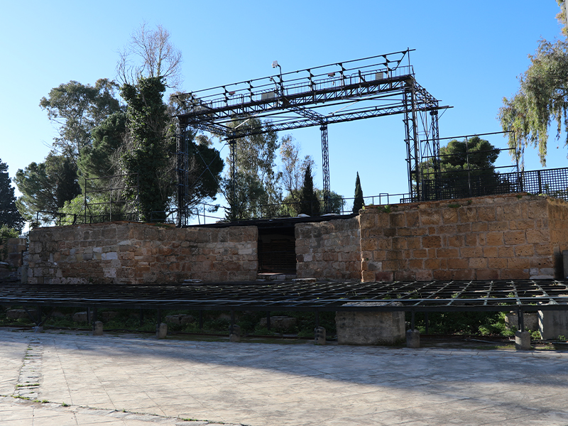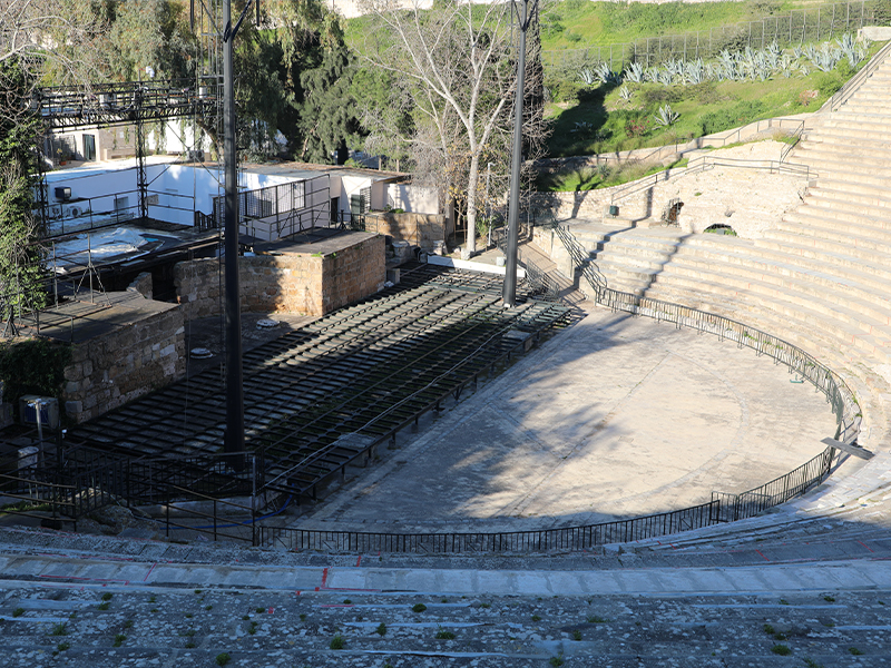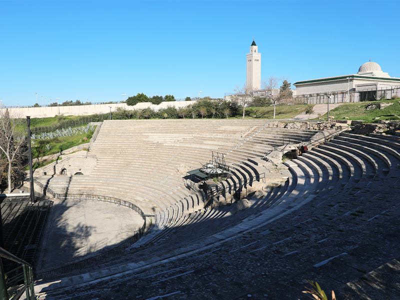 ومن بين العناصر التي أملت اختيار موقع هذا المعلم في الضواحي الشمالية الغربية للمدينة المتطلبات الصوتية، والحرص على يسر الوصول إليه، عن طريق طريقين رئيسيين إلى شمال وجنوب المعلم والاستفادة من التضاريس لاقامة المدارج العليا.