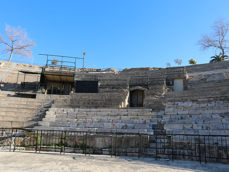 وكان الركح، مسنودا بجدار خلفي على ثلاثة طوابق، ثري الزخرفة كما يتضح ذلك من تنوع العناصر المعمارية التي تم العثور عليها. ومن روائع التماثيل المكتشفة أثناء التنقيب تمثال ضخم للإله أبولو بيثيان المصنوع من رخام ثاسوس، و40 وقد نُصب تمثال أبولو، الذي يصل ارتفاعه الى مترين و40 سم، في المسرح الروماني بصفته إله الفنون.