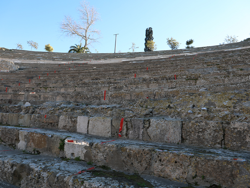 وقد صُمم المسرح، الذي تصل سعته الى عشرة آلاف متفرج، وفق مخطط كلاسيكي، يستجيب للقواعد التي وضعها المهندس ولمعماري الروماني فيتروفيان، ويتضمن مدراج قطرها 106 أمتار، وهي موجهة نحو الجنوب الشرقي ورواقين مقبّيين يتيحان الوصول إلى المقاعد من الجانبين، على مستوى المدرجين الثاني عشر والعشرين.