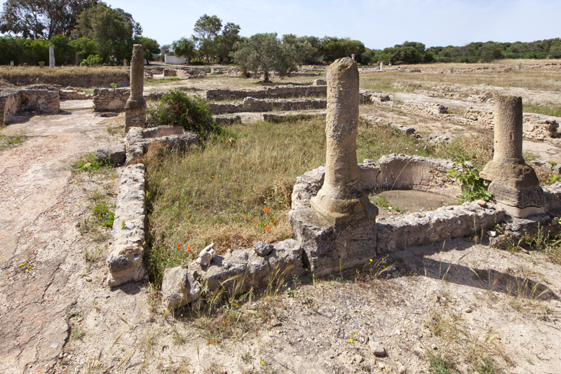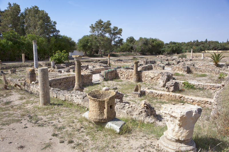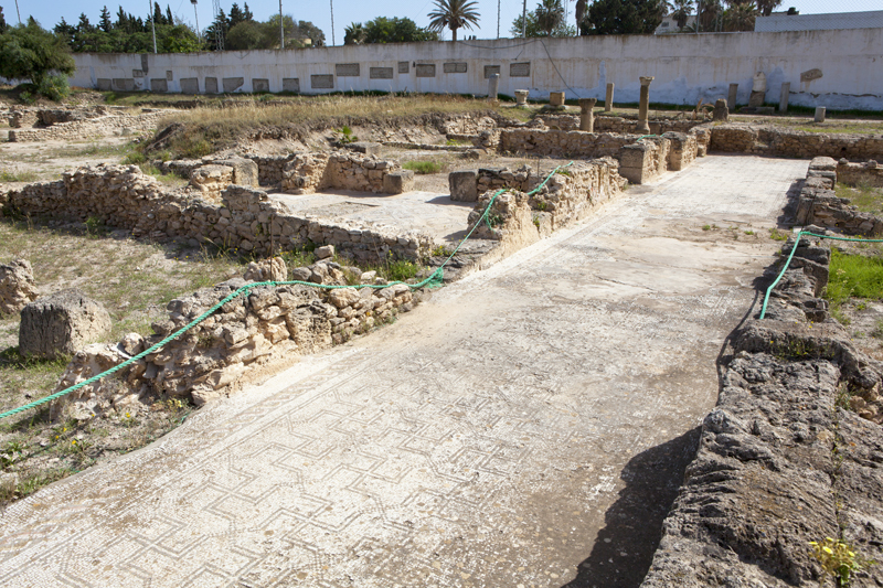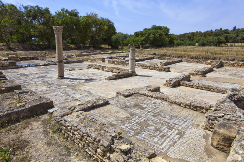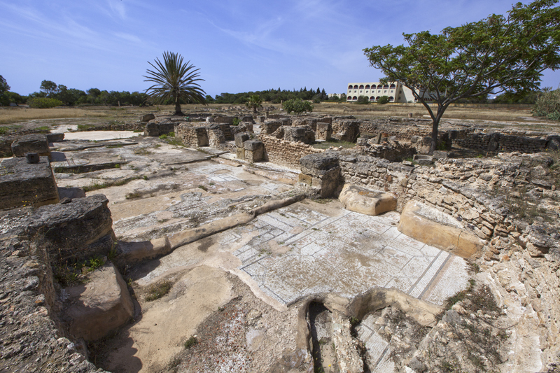 - قاعة الفناء المعمد االمزخرف بصور (القرنان الرابع والخامس) والذي استُمد تسميته من لوحة الفسيفساء التي تعيد إنتاج الظل الذي تلقيه أعمدة الرواق المحيط بها على الأرض. ومن بين عناصرالزينة فسيفساء وسط الفناء تجسد منارة تشع نورا،تيمّنابها لرحلات بحرية نهايتها سعيدة. ويؤدي الركن الشمالي الشرقي من الفناء إلى حمام خاص صغير.