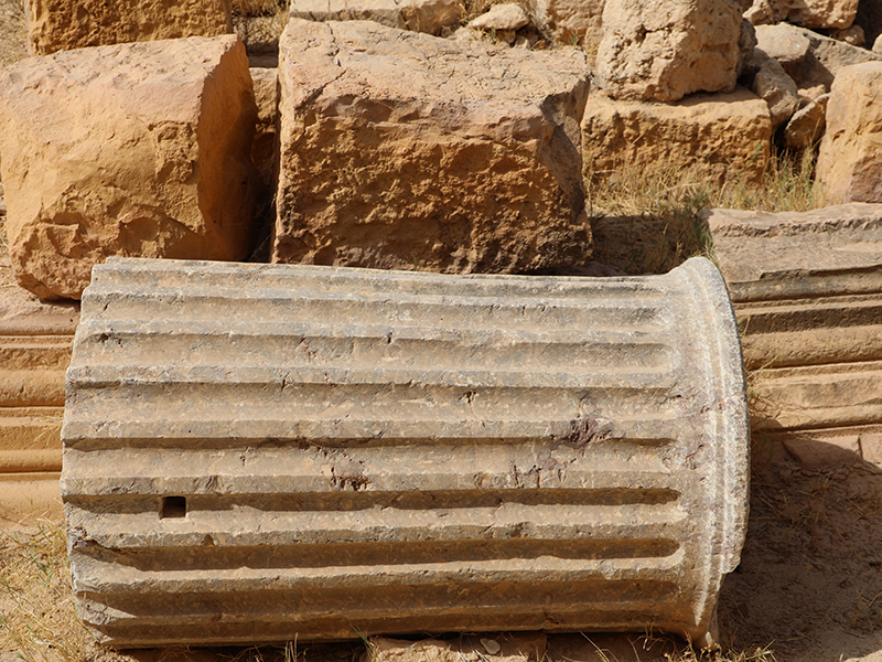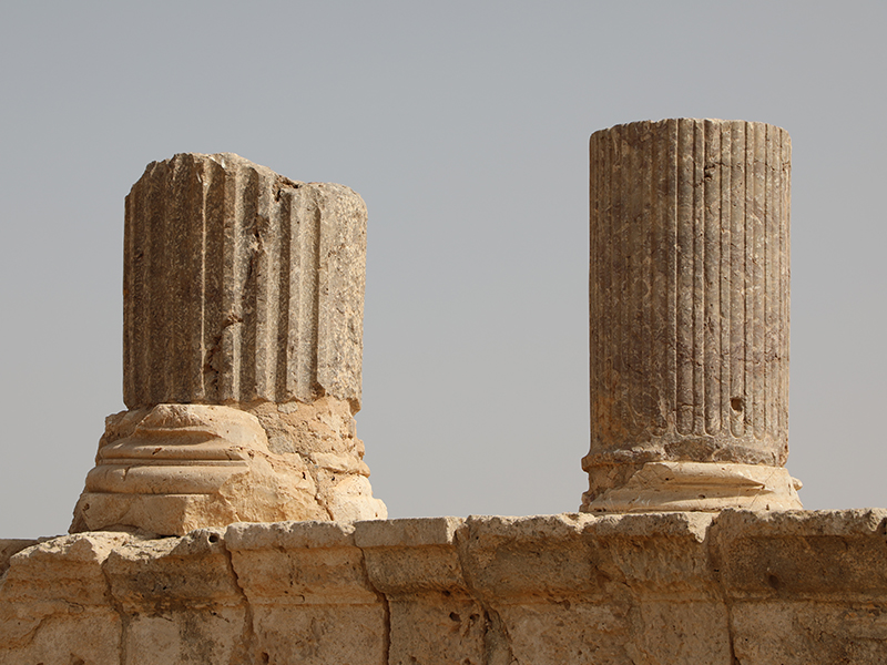 ويفتح الرواق الشرقي على اليسار باتجاه معبد 'ليبارباتار'وعلى اليمين باتجاه بازيليقا (قاعة العدالة) ذات البلاطات الثلاث المتوازية والأروقة ومنبر في الخلف، ثم باتجاه معبد كبير غير محددالهويّة، يرتفعبالقرب منه معبد صغير لإله الطب إسكولابيوس.