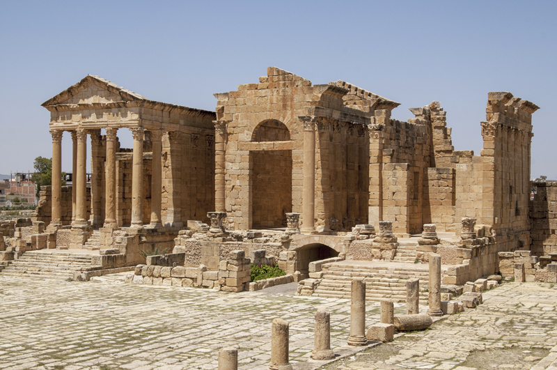 يُعتبر الكابيتول معلما نادرا من نوعه في الهندسة المعمارية الدينية الرومانية، حيث يتكون من ثلاثة معابد خُصّص كل واحد منها لإله. وشيدت هذه المعابد، وهي معبد "جوبيتار" ومعبد "جينون" ومعبد "مينارفا" على جانب الساحة العمومية، التي يتميز مدخلها بالقوس المُهدى إلى الإمبراطور"أنطونينوس" سنة 139م.