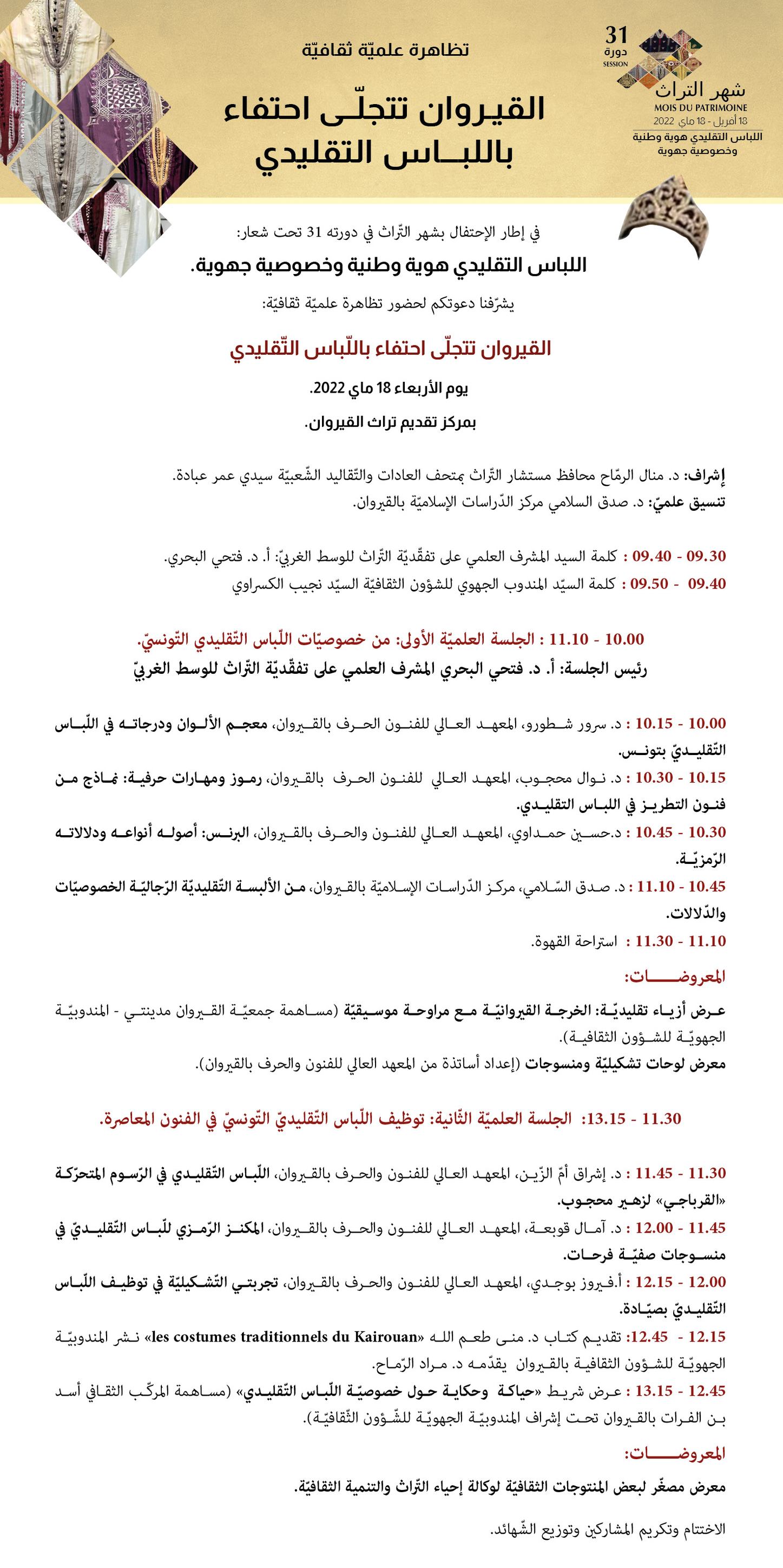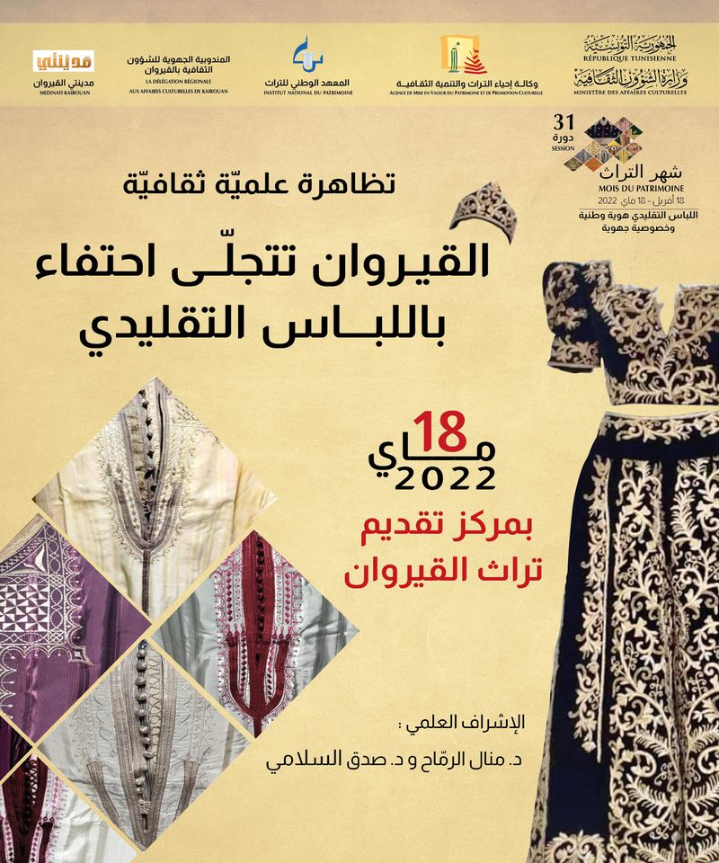 As part of the celebrations of the Heritage Month in its 31st session, organized under the theme "Traditional Dress: a National Identity and a Regional Specificity," the Agency for the Development of Heritage and Cultural Promotion (AMVPPC) in partnership with the National Institute of Heritage (INP), the Regional Delegation of Cultural Affairs in Kairouan, the "Kairouan Madinati" Association, is organizing a cultural and scientific manifestation under the theme "Kairouan is Flourishing in Celebration of the Traditional Dress" on Wednesday, May 18, 2022, at the Kairouan’s Heritage Interpretation Center.