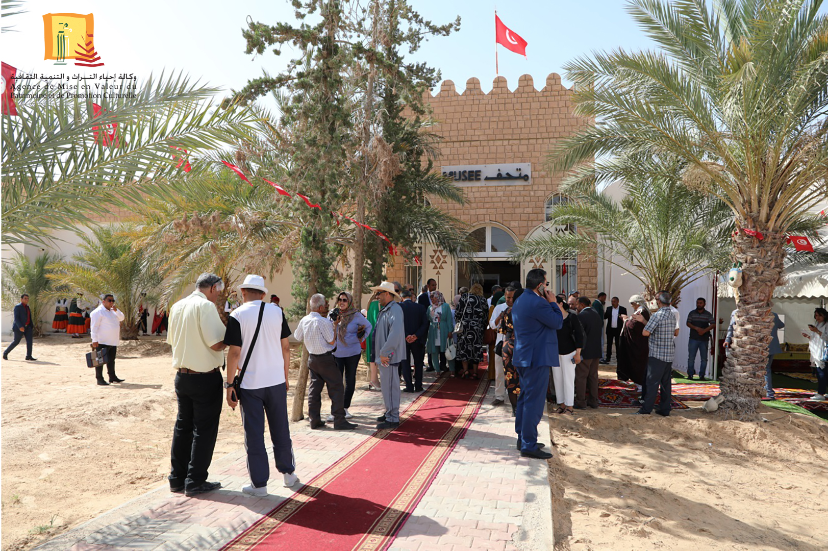 The closing ceremony of the Heritage Month began with Mr. Belgacem Zarrouk, the Conservator of the Museum, presenting the components of the Sahara Museum in Douz. Then, the attendees joined lively workshops around different crafts such as the manufacture of the Balga of Marzouguiya, the embroidery of "the Melhfa", the fabrication of the "Bakhnoug", the embroidery of the "Jebba", the "wazra", the "Lahfa", the weaving, the fabrication of the "mdalla." They attend then a photographic exhibition related to the theme of the Heritage Month, "the Traditional Clothing: a National identity and a Regional Specificity."