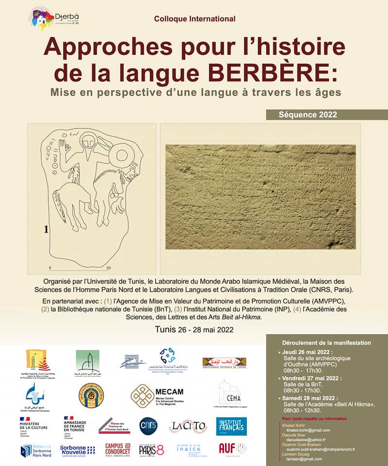 The studies around the Berber language have made significant progress around themes that would benefit from conquering the scientific field. They are quite diverse in the course of the history of North Africa. Thus, several approaches have been examined within a spectrum of disciplines in the humanities and auxiliary sciences that reconcile fields like Linguistics, Philology, Archaeology, Ancient and Medieval History, Anthropology, and Population Genetics. This symposium will bring together some of the most prestigious Tunisian, French and Algerian institutions, including the University of Tunis, the Medieval Arab-Islamic World Laboratory, the North Paris House of Human Sciences (MSH Paris Nord), and its supervisory bodies, namely: CNRS, University of Paris 8, and University of Sorbonne Paris Nord, and the scientific laboratory of Languages and Cultures of Oral Tradition (LACITO, UMR 7109: CNRS / INALCO /Paris 3 Sorbonne New University) as well as the General Delegation for the French Language and Languages of France (DGLFLF). This meeting is the fruit of a partnership between the Agency for the Development of Heritage and Cultural Promotion (AMVPPC), the National Library of Tunisia (BnT), the National Heritage Institute (INP) and the Academy of Sciences, Letters and Arts, known as Beit al-Hikma. This collaboration between several institutions has then been extended by other entities such as the French Institute of Tunisia (Tunis), the Center for Maghrebian Studies in Algeria of Oran (CEMA), and the Merian Centre for Advanced Studies in the Maghreb (MECAM). We are confident that this cross-disciplinary project, which is the fruit of multilateral cooperation, will fulfill all its promises for the sake of research and heritage valorization.