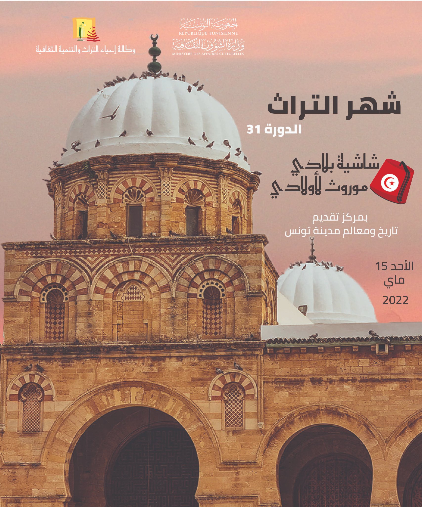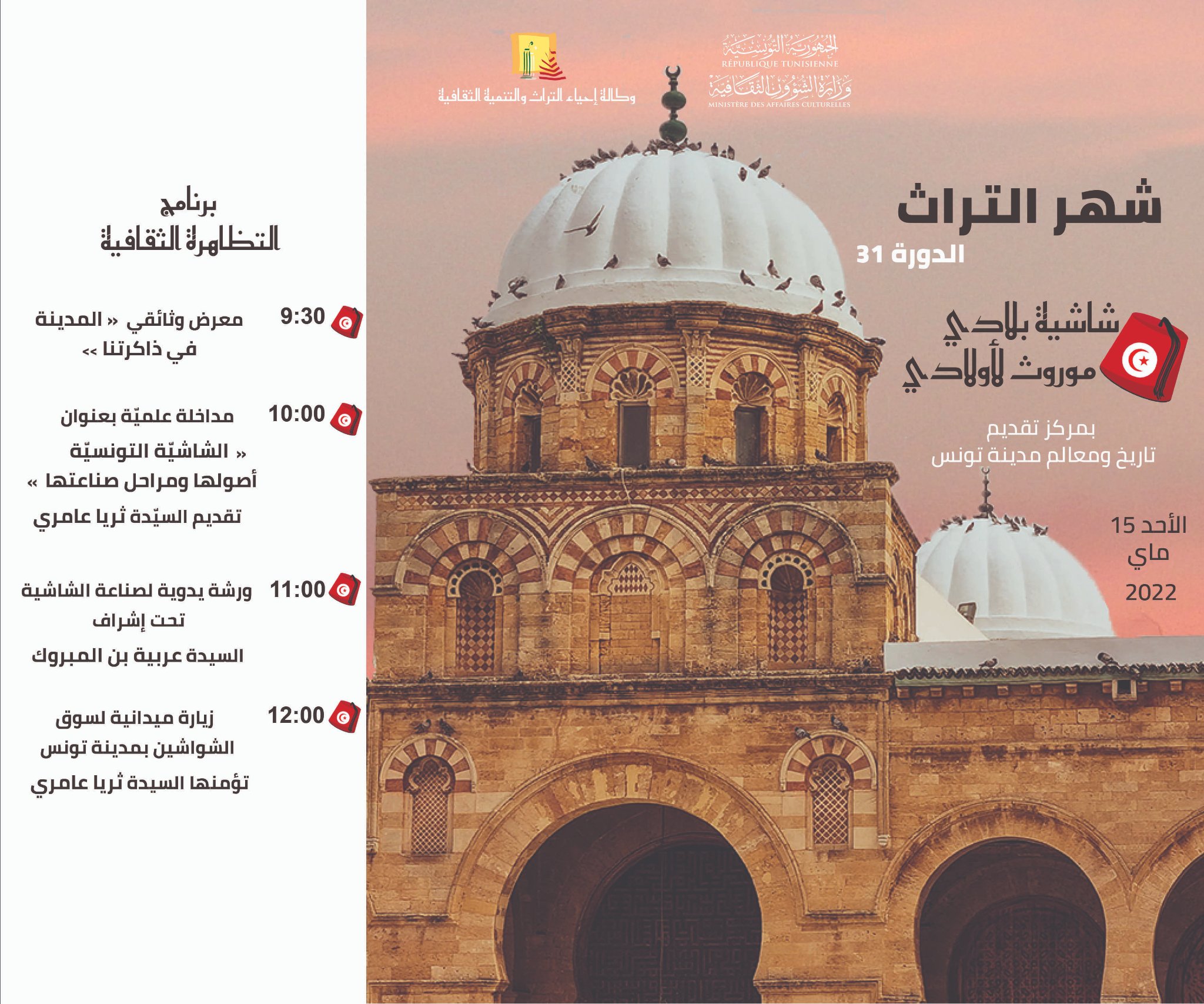 Dans le cadre de la célébration du mois du patrimoine dans sa 31ème édition organisé sous le thème de « l’habit traditionnel, identité nationale et spécificité régionale », l’Agence de Mise en Valeur du Patrimoine et de Promotion Culturelle organise une manifestation le dimanche 15 mai 2022 au Centre de Présentation de l’Histoire et des Monuments de la Médina de Tunis.