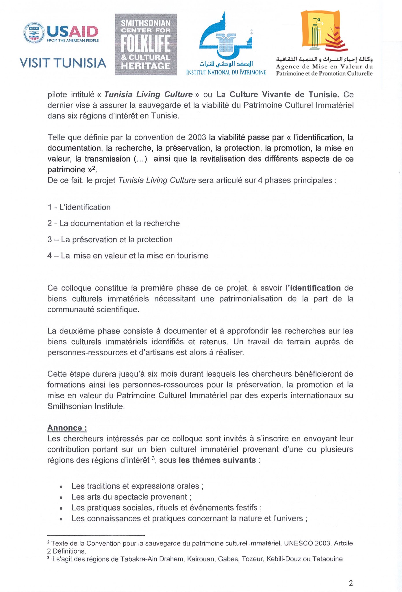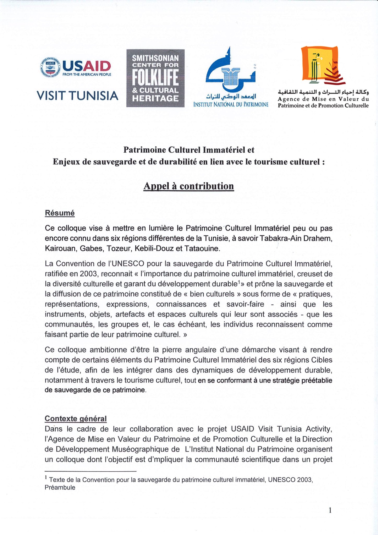 Dans le cadre de leur collaboration avec le projet USAID Visit Tunisia Activity, l’Agence de Mise en Valeur du Patrimoine et de Promotion Culturelle et la Direction de Développement Muséographique de L’Institut National du Patrimoine organisent un colloque dont l’objectif est d’mpliquer la communauté scientifique dans un projet pilote intitulé « Tunisia Living Culture » ou La Culture Vivante de Tunisie. Ce dernier vise à assurer la sauvegarde et la viabilité du Patrimoine Culturel Immatériel dans six régions d’intérêt en Tunisie.