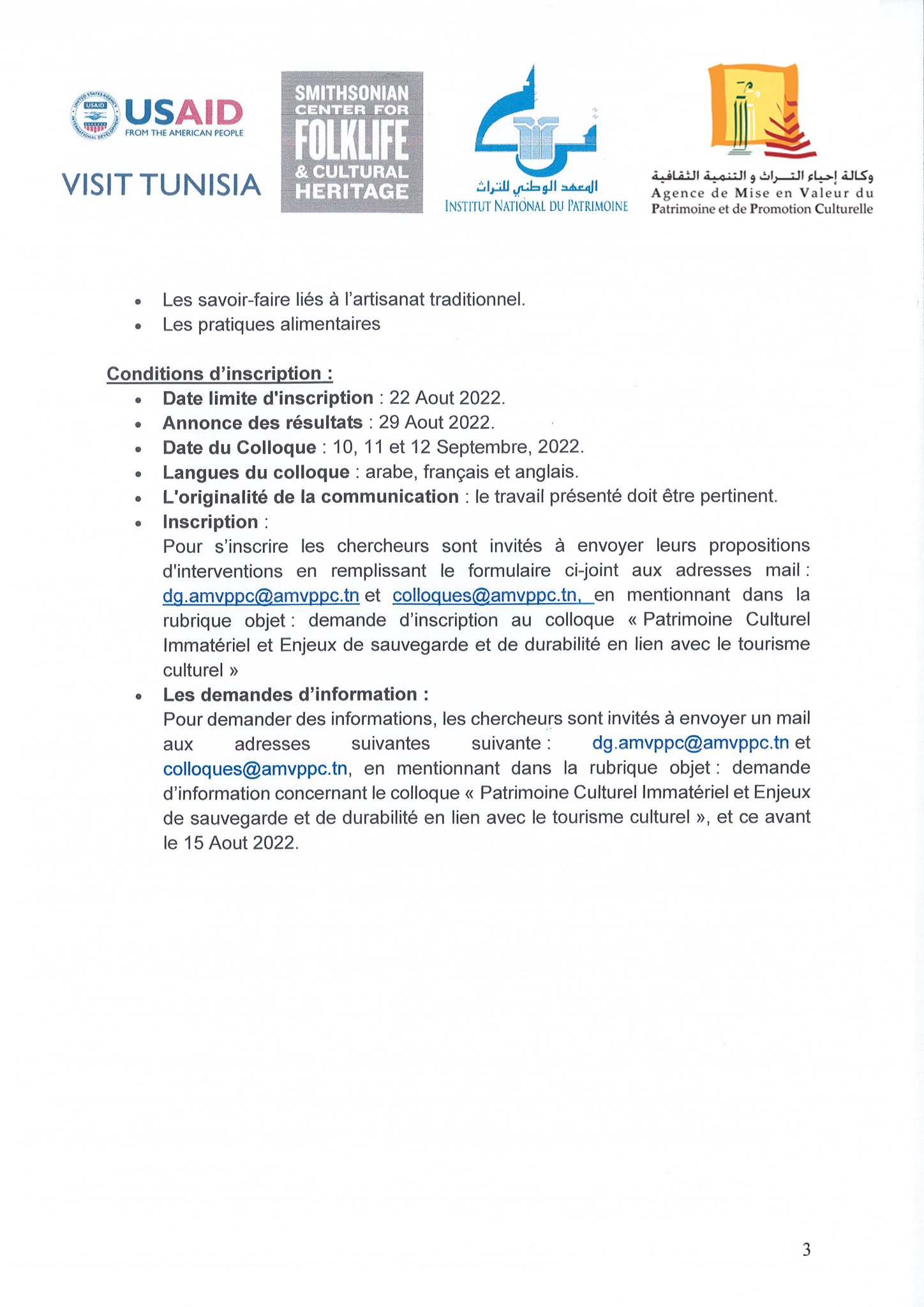 Pour demander des informations, les chercheurs sont invités à envoyer un mail aux adresses suivantes suivante : dg.amvppc@amvppc.tn et colloques@amvppc.tn, en mentionnant dans la rubrique objet : demande d’information concernant le colloque « Patrimoine Culturel Immatériel et Enjeux de sauvegarde et de durabilité en lien avec le tourisme culturel », et ce avant le 15 Aout 2022.